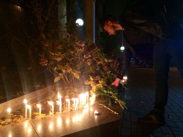 У здания французского дипломатического представительства киевляне зажигают лампадки и свечи в знак скорби по погибшим от рук террористов парижанам. Лестница посольства уже уставлена нескольким сотнями свечей.