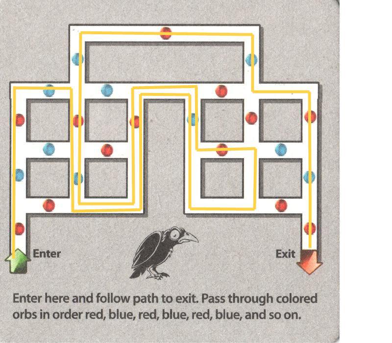 Суть: нужно дойти от зеленой стрелки до красной, чередуя цвета меток — красная-синяя-красная-синяя и так далее. Можно проходить дважды через одну и ту же метку.