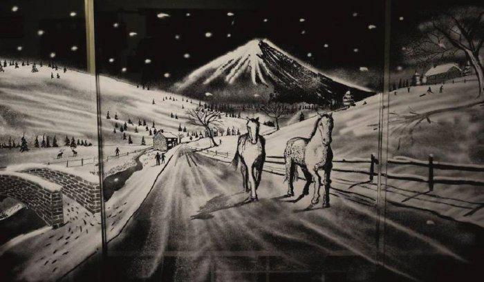Сначала, художник распыляет на стекла поддельный снег, а потом берет кисть и создает свои «оконные» шедевры. Выглядит отдаленно похоже на рисунки, которые создает мороз в зимнее время на окнах, с той лишь разницей, что у Тома все объекты на стеклах четкие и осознанные.