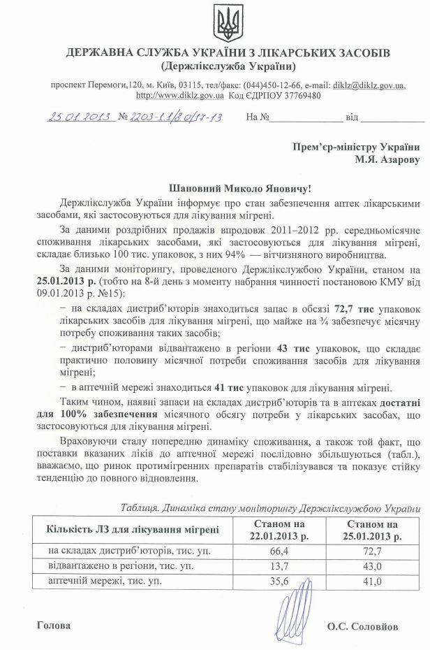 А в подтверждение он приложил ответ на свой запрос председателя Государственной службы Украины по лекарственным средствам Алексея Соловьева, в котором написано, что все аптеки страны на 100% обеспечены лекарствами от мигрени.