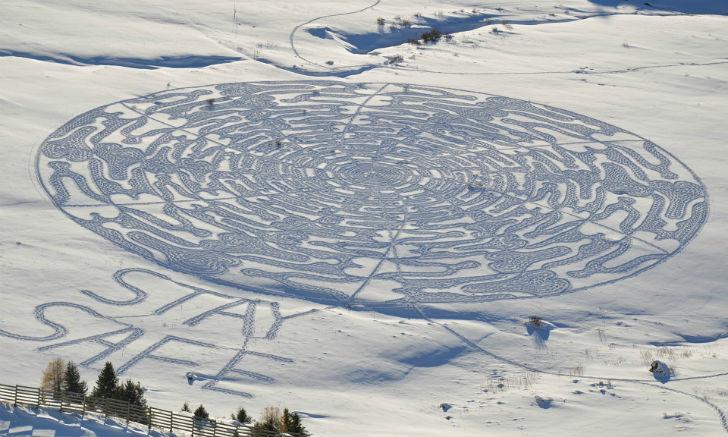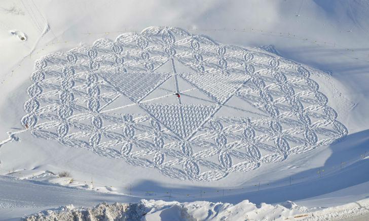 Каждую зиму у Саймона Бека выходит около 30 снежных узоров. 10 лет назад художник начал вытаптывать только что выпавший снег в качестве хобби, теперь же занятие для собственного удовольствия превратилось в профессию.