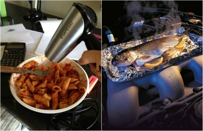 Как приготовить еду, если ничего нет, кроме фена, как разогреть пиццу, если у вас новый ноутбук, как сварить пельмени, если нет кастрюли, но есть чайник.