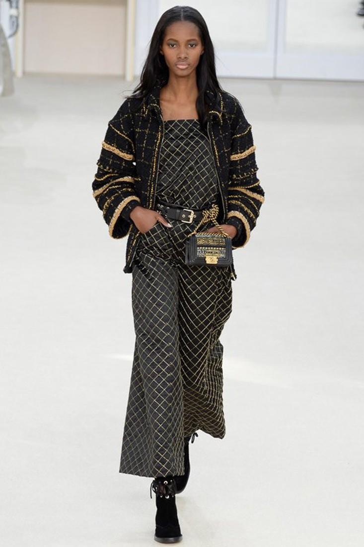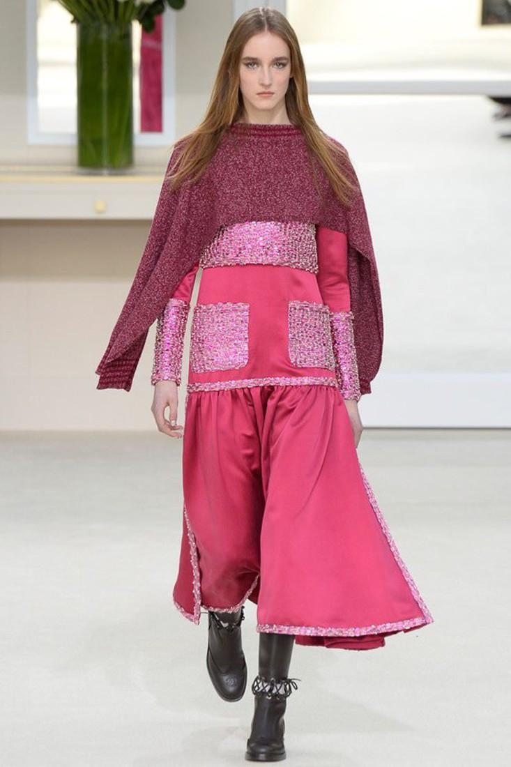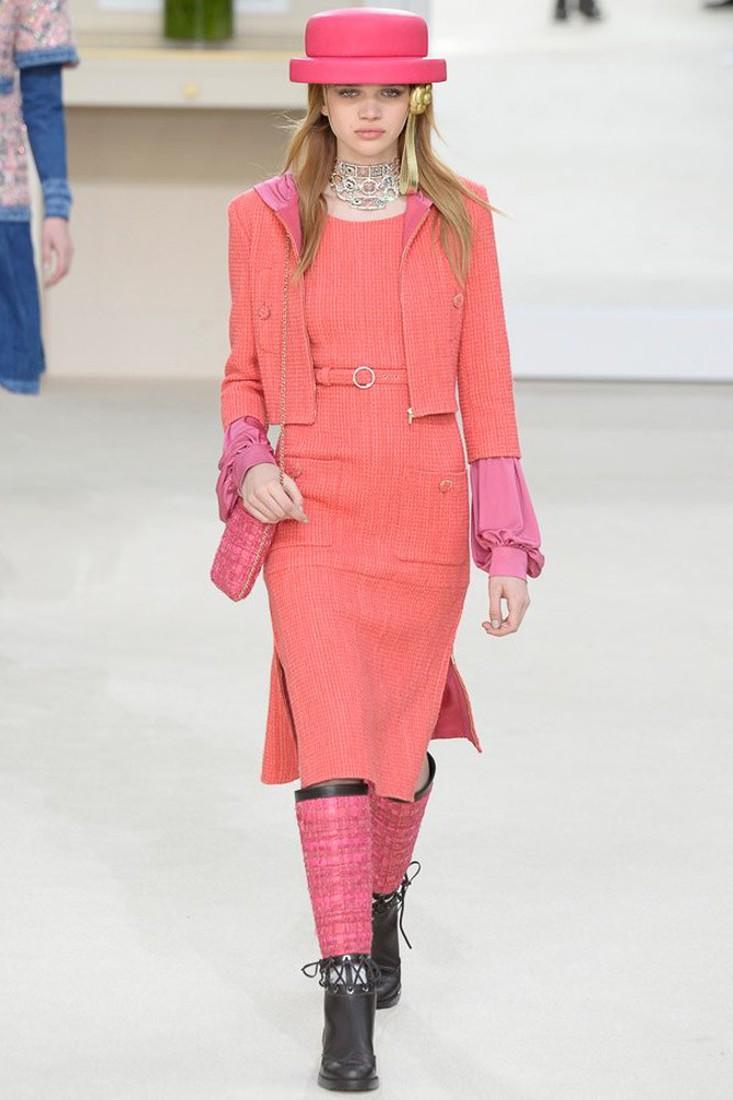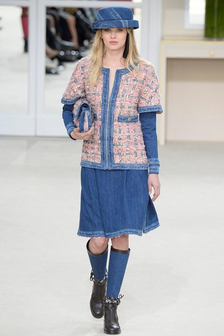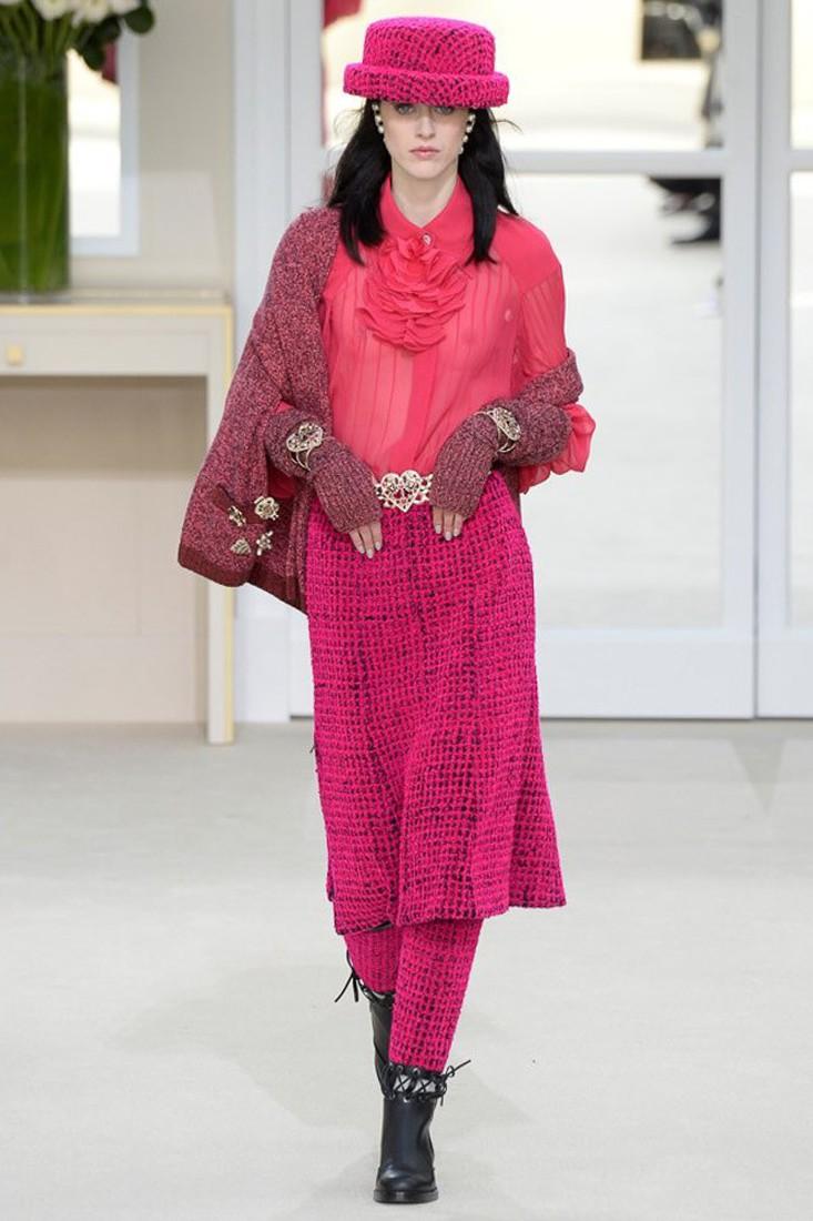 Яркие оттенки – вот что бросается в глаза в первую очередь! Такое разнообразие цветовой палитры присутствовало в коллекциях марки разве что в 90-е годы. Красный, синий, желтый, розовый, бордовый – Лагерфельд не сдерживал себя. Компанию любимому твиду составили ярко-синий деним и шелк нежных оттенков.