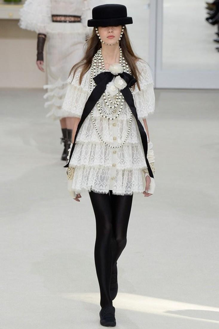 Осенне-зимняя коллекция Chanel получилась очень женственной и романтичной. Не было здесь ни фантазийных нарядов, ни сумок странной формы, ни необычной обуви – лишь твидовые комплекты, состоящие из жакета и юбки, вязаные джемперы, кардиганы и белоснежные кружевные платья (в таком и под венец можно пойти).