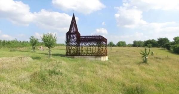 Скульптура состоит из металлических пластин, и при взгляде с высоты похожа на обычную старую церковь.