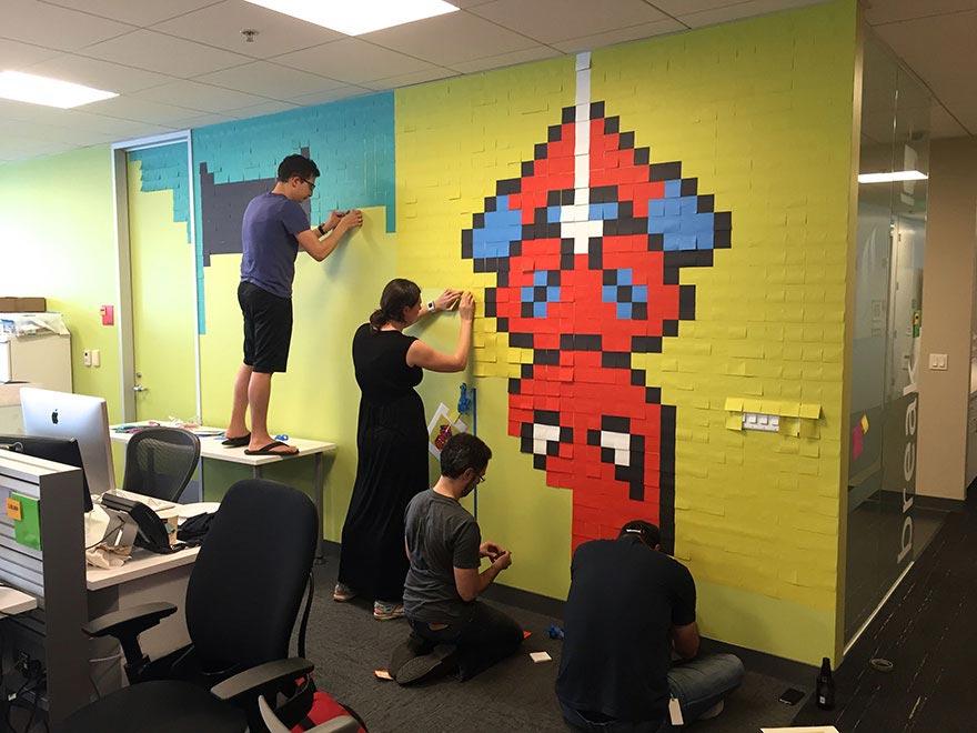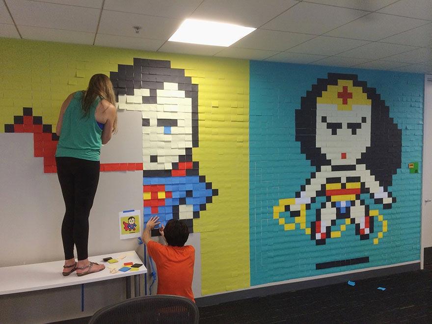 Его идея заключалась в том, чтобы покрыть скучные стены офиса серией супергеройских портретов, выложенных из стикеров, которых в конечном итоге ему потребовалось 8024 штуки.