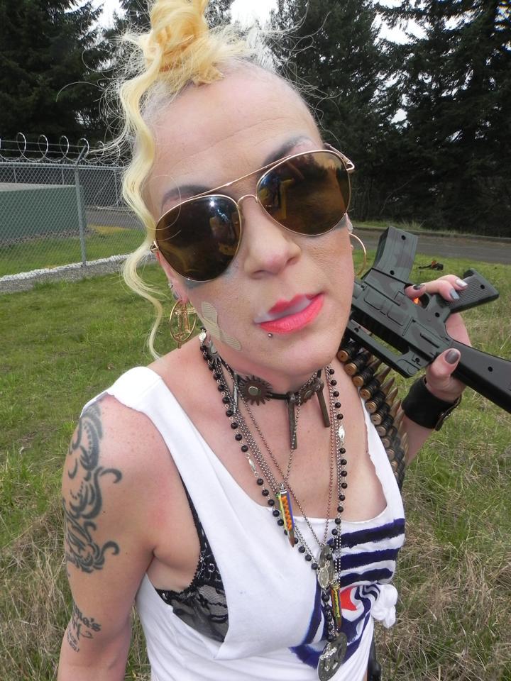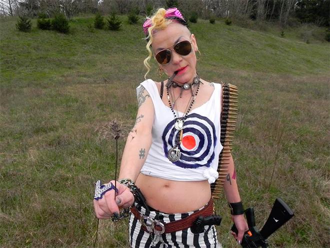 На опубликованных фото Крис Эванс изображена в весьма необычном виде с игрушечным автоматом, пулеметной лентой, в коротких шортах и рванных колготках, а также с выбритой головой, за исключением небольшого пучка волос.