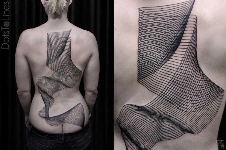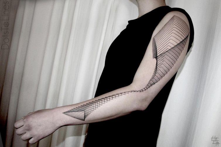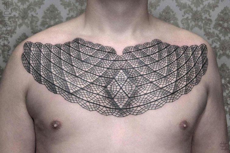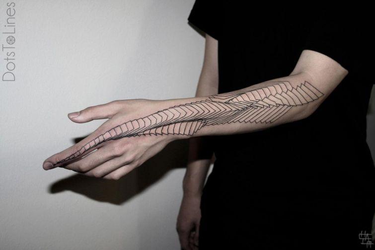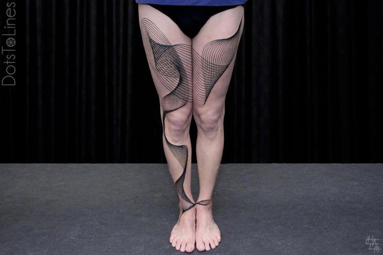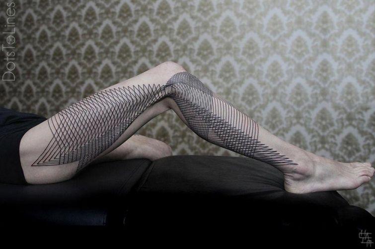 Кроме геометрических татуировок берлинский художник работает в стиле дот-ворк и допускает в своих работах более традиционные элементы.