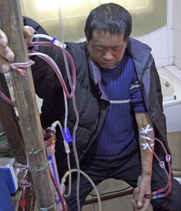 Каждая проведенная в домашних условиях процедура по диализу крови обходится крестьянину в шестьдесят юаней, что в восемь раз дешевле, чем в клинике. Жидкость для диализа китаец готовит сам, используя воду, пищевую соду, а также хлориды калия и натрия. Подключаясь к аппарату, «самодельщик» в катетеры на венах своей руки вводит две трубки, через одну кровь откачивается, а через вторую возвращается уже очищенной от всякого химического «мусора».