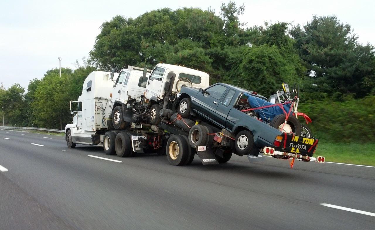В американских правилах есть похожие пункты. Однако водителя грузовика из Нью-Джерси это не смутило... И он решил за один раз перевести на своем грузовике еще один грузовик. И еще один. И еще пикап. И мотоцикл. Не хватает только велосипеда и самоката.