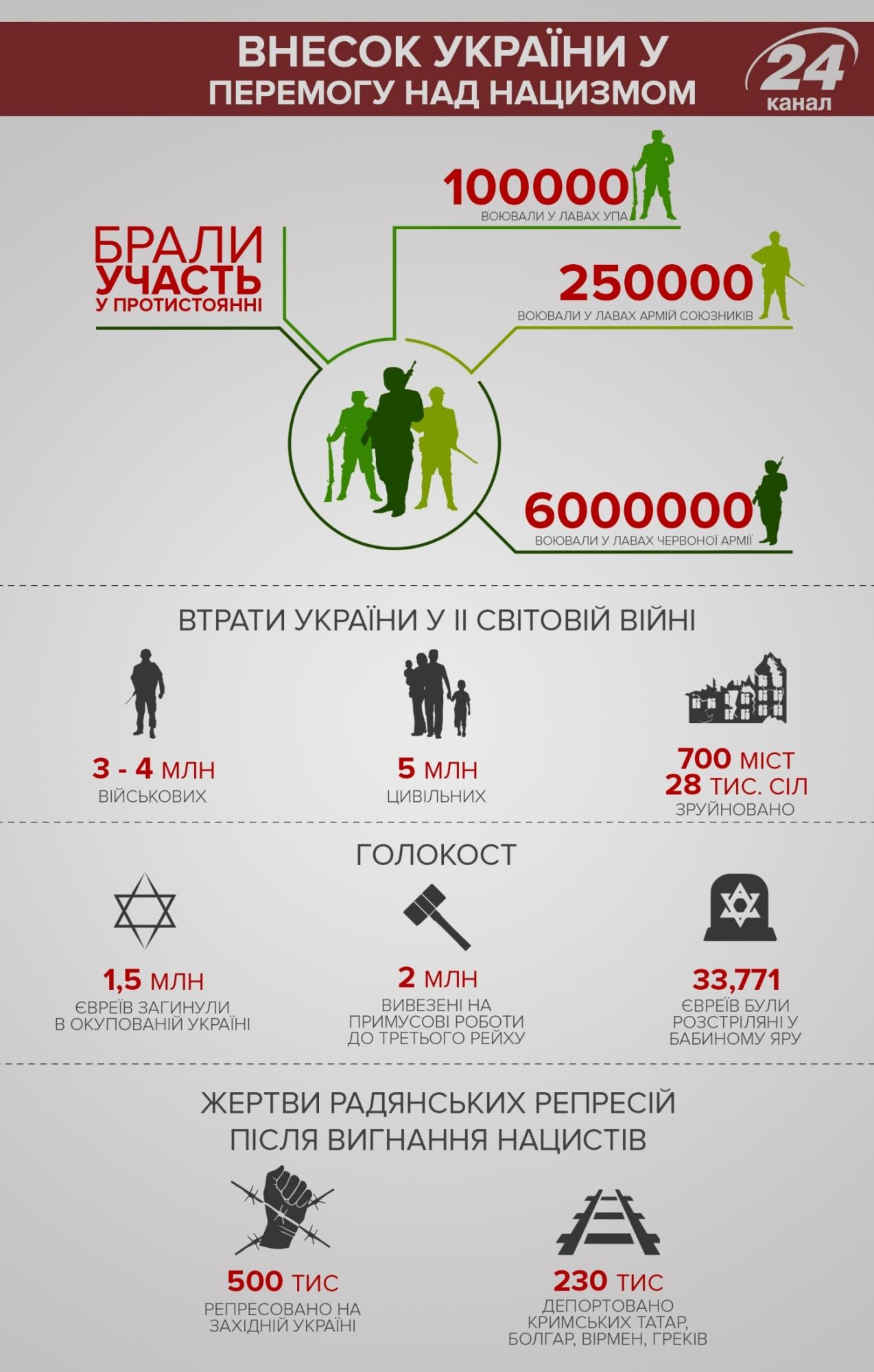 Не стоит забывать, что Украина также внесла большой вклад в победу над национал-социализмом. Глядя на эти цифры, у каждого человека просачивается слеза. Начиная с 2014 года в нашей стране появился новый символ победы над нацизмом - красный мак, который люди одевают для того, чтобы почтить память всех погибших героев.