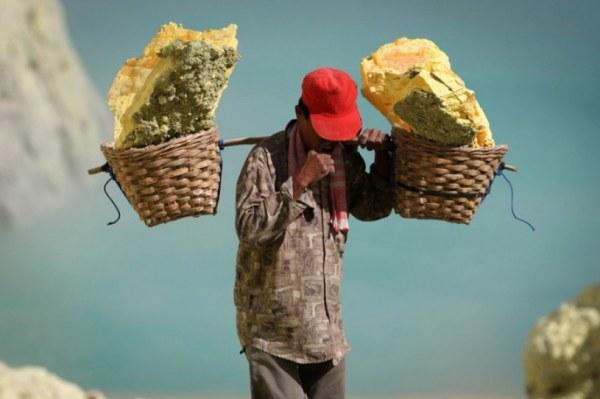 Мужская работа: как добывают серу у вулкана в Индонезии (ФОТО