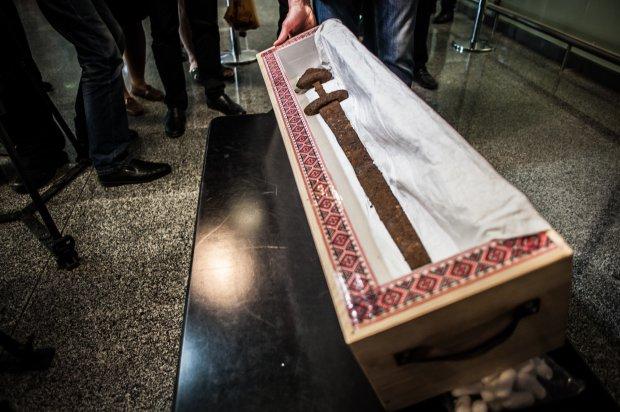 В Международном аэропорту "Борисполь" торжественно встречали представителей украинской официальной делегации, которые вернули в Украину незаконно вывезенный за границу древний меч викингов.