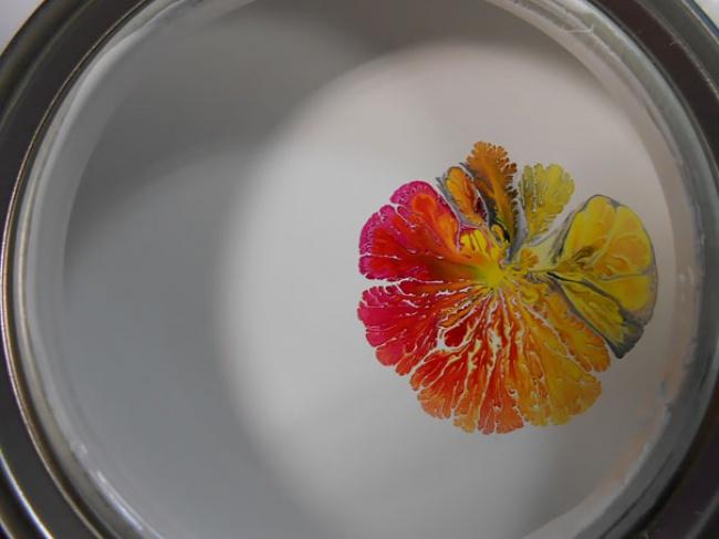 Извержение вулкана — капли черной и желтой краски упали в банку белой.
