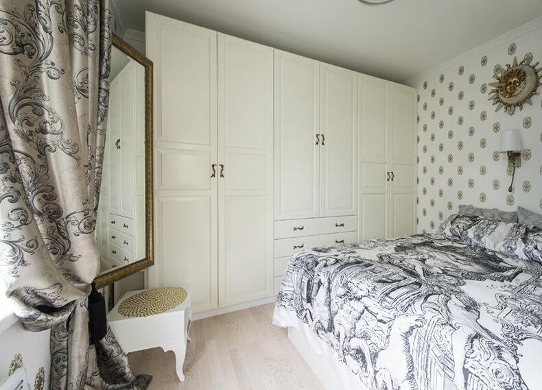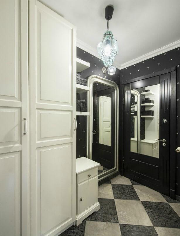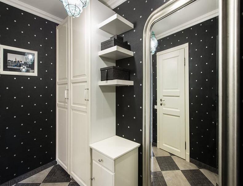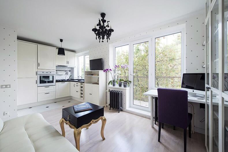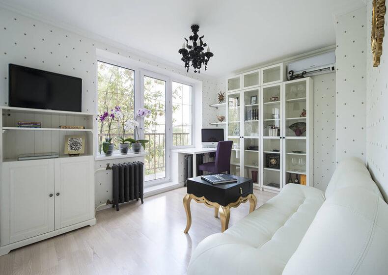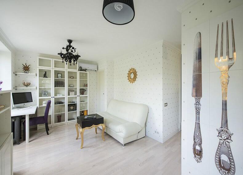 Почти вся мебель в квартире — невесомая, светлая, с объемными филенчатыми фасадами. Черные и металлические детали выглядят на таком фоне очень выразительно. Их немного, что совсем не вредит общей «воздушности» интерьера.Читайте также: В тесноте, да не в обиде. Как выглядит железнодорожный рынок в Таиланде (ФОТО)Интерьер квартиры оформлен в черно-белых тонах, но преобладающий цвет в комнатах — белый, что визуально расширяет пространство. Обои с мелким редким рисунком, На первый взгляд, в горошек, а на самом деле, в цветок, придают помещению дополнительный объем. Обои — вообще одна из главных «фишек» интерьера. За счет белого фона, рисунка с геральдическими мотивами и плотной фактуры они выглядят аристократично, светло и уютно.