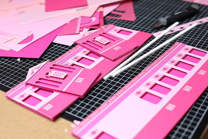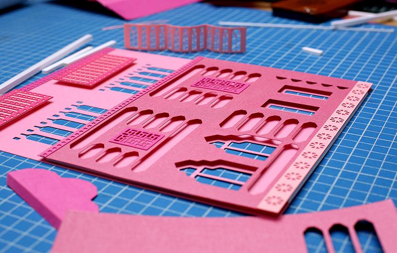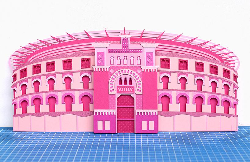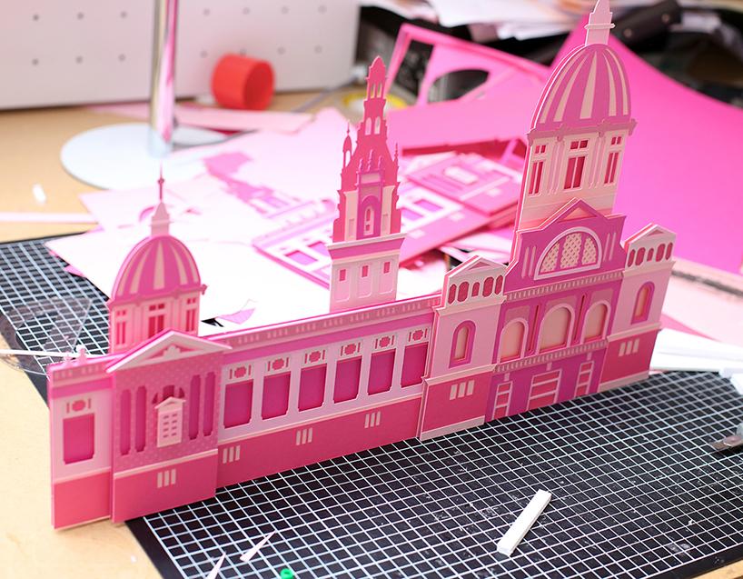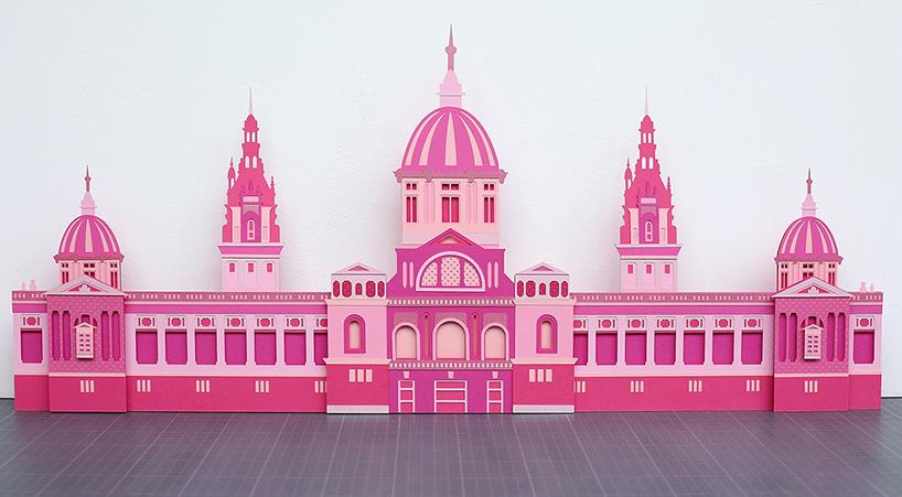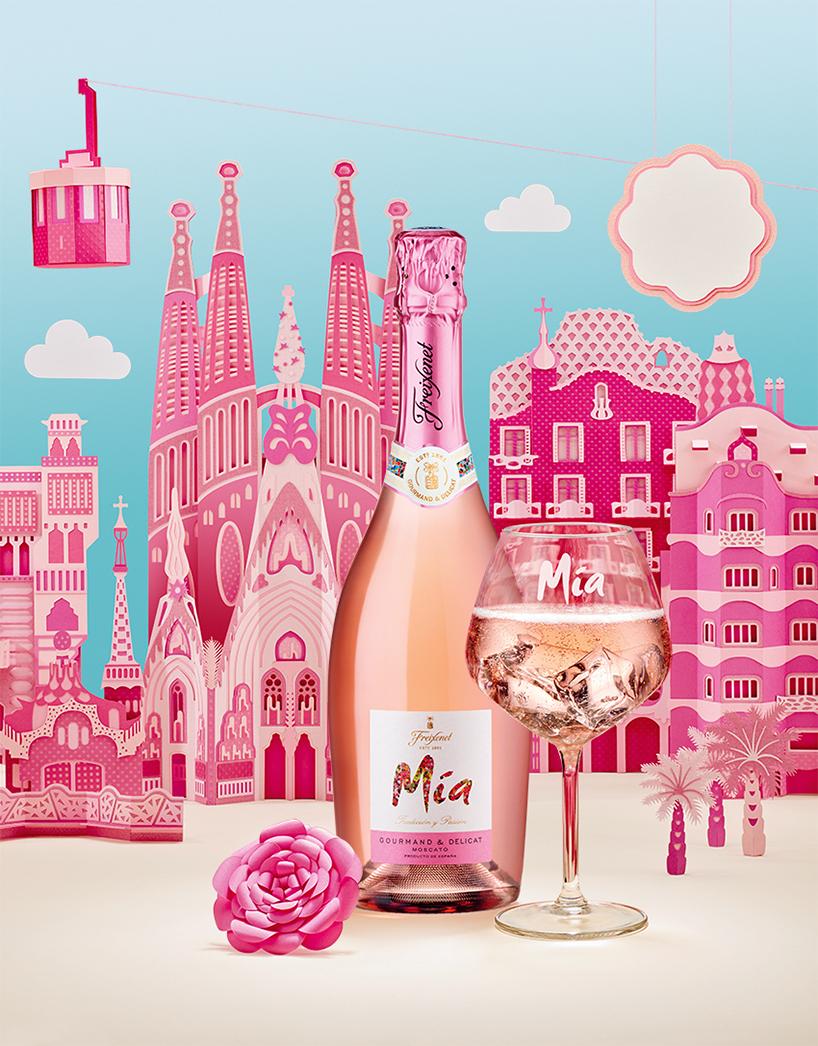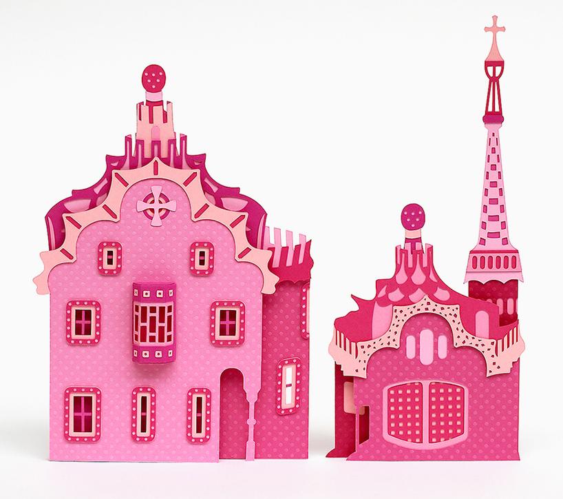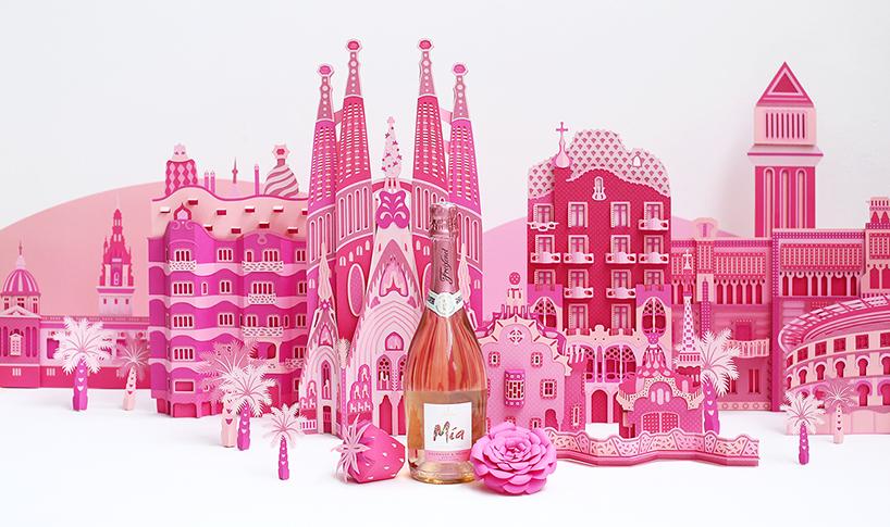 Они вырезали пейзаж Барселоны из розовой бумаги. Абсолютно все дома и архитектурные достопримечательности повторяют реальные сооружения. Если присмотреться, то заметно, что все здания делали по формату 3D. Архитектурные объекты получились немного объемными. А белое игристое шампанское очень удачно вписывается в жаркую атмосферу Барселоны.
