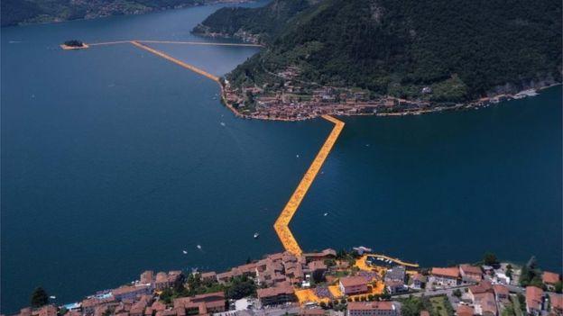 Ему удалось создать трехкилометровый водный тротуар на озере Изео, которое находится на территории северной Италии. Такую необычную пешеходную дорожку по водной глади художник предложил сделать из обычных пенопластовых кубов, а затем обернуть их красивым желтым нейлоном.
