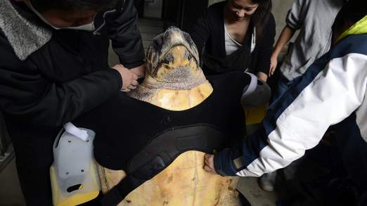 Ученые в Японии разработали для 96-килограммовой черепахи Ю, пострадавшей в схватке с акулой, специальный жилет, на который крепятся протезы.