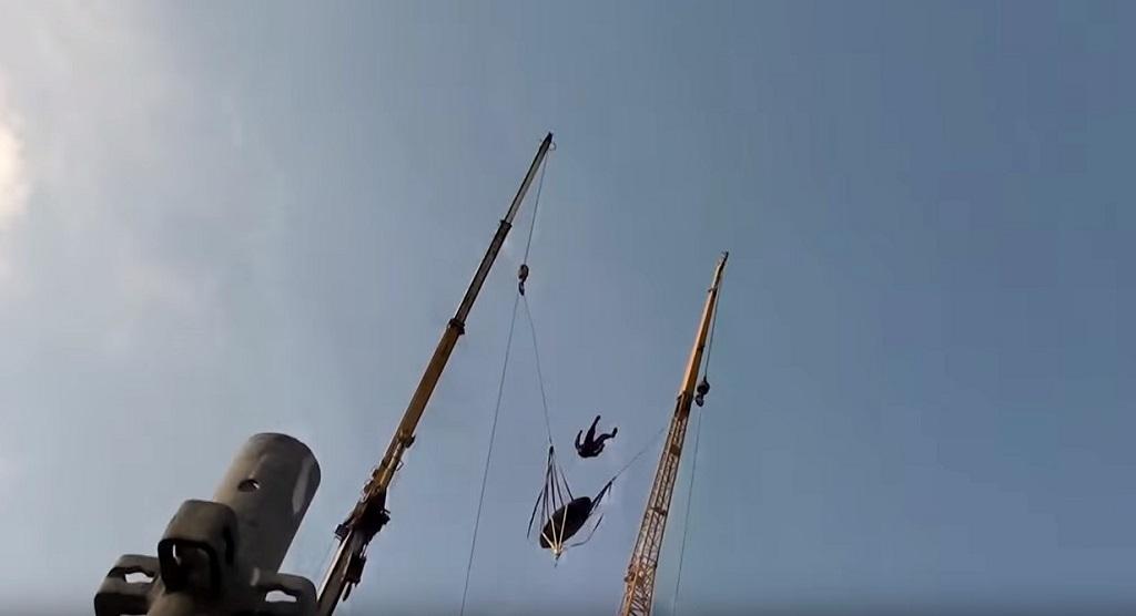 Экстремалы Крис Макдугалл и Джимми Пуше соорудили из двух автокранов самодельный аттракцион, который действует по принципу рогатки.
