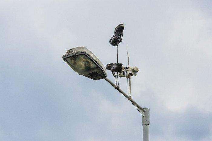 Очевидно, что речь идет об игре слов с типичным «Вверх тормашками» (Upside Down). То есть, в итоге, получаем дважды вверх тормашками. Кроссовки висят на фонарных столбах, но висят вверх.
