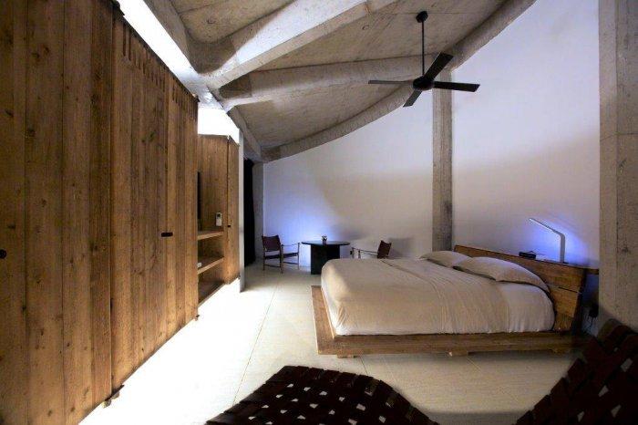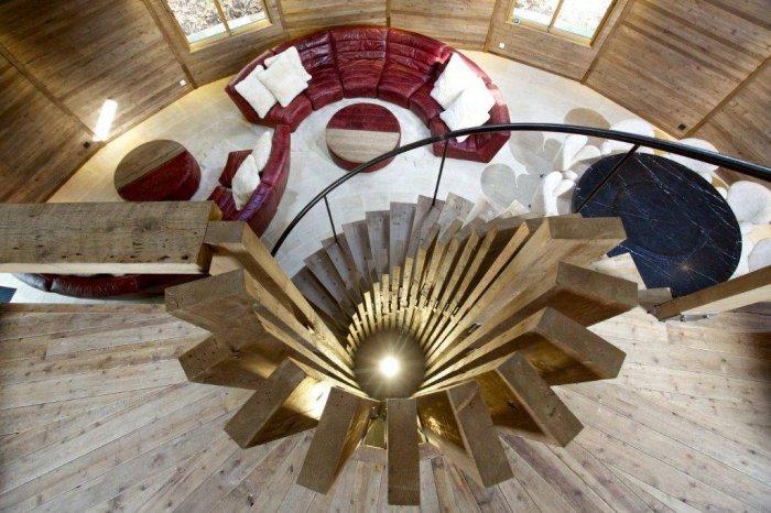 Главная особенность такого дома – в нем нет опор, а круглое внутреннее пространство создает впечатление отсутствия инородности интерьера. В доме есть все необходимое, а комнаты отделены с помощью системы зонирования, за исключением санузлов.
