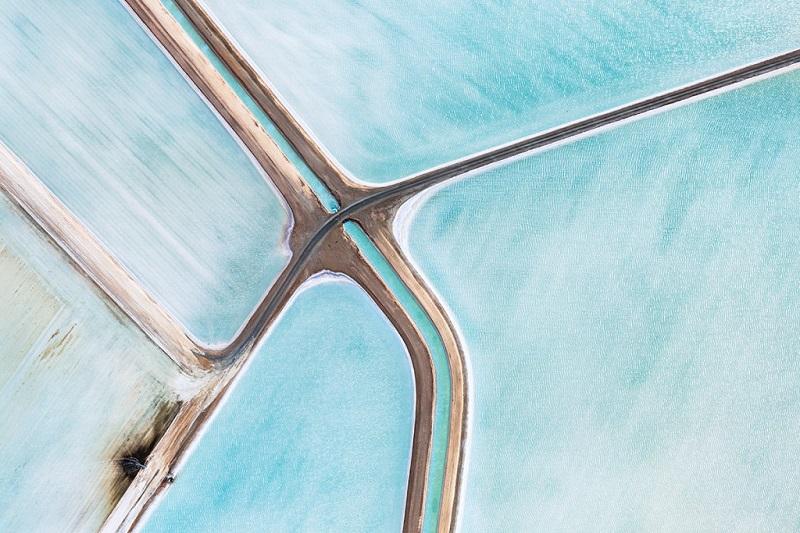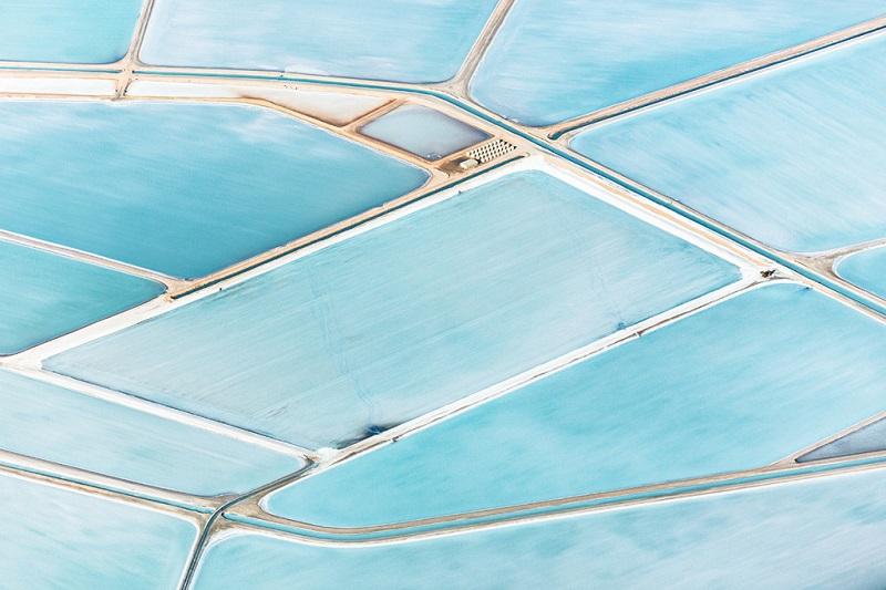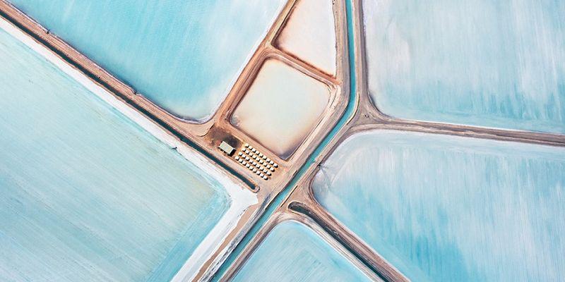 Запечатленные с помощью аэрофотосъемки водоемы на западе Австралии выглядят очень сюрреалистично, словно это вовсе не фотографии, а акварельные картины, изображающие абстрактные узоры. На самом деле снимки демонстрируют обыкновенные искусственные пруды, из которых испаряется концентрированный солевой раствор, оставляя урожай соли.