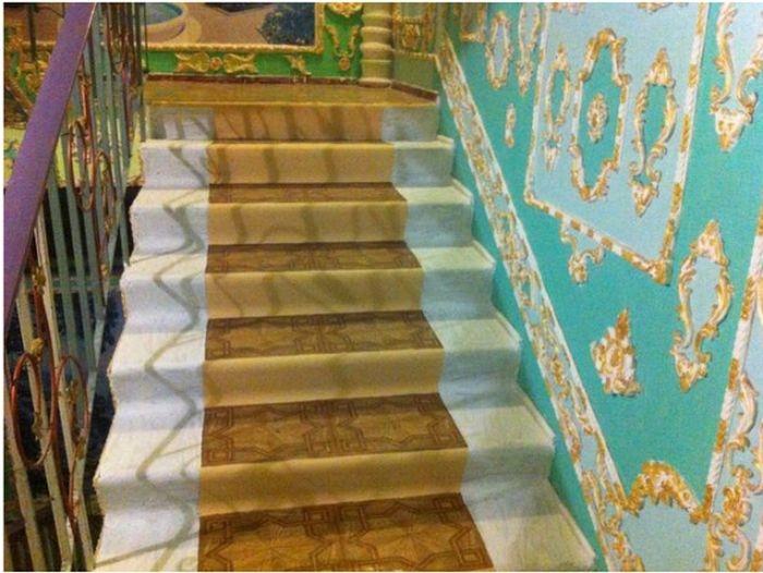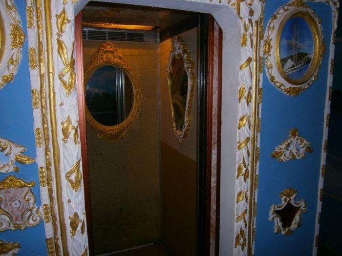 Стены подъезда украшены женскими портретами, лепниной с «позолотой», фотообоями и картинами. Особой гордостью пенсионера является мусоропровод, переделанный под античные колонны с атлантами, и ангелы на потолке.