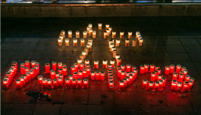 Жители Харькова, где во времена страшной трагедии погибли около 2 миллионов человек, выложили в центре города кресты из более чем 500 зажженных свечей.