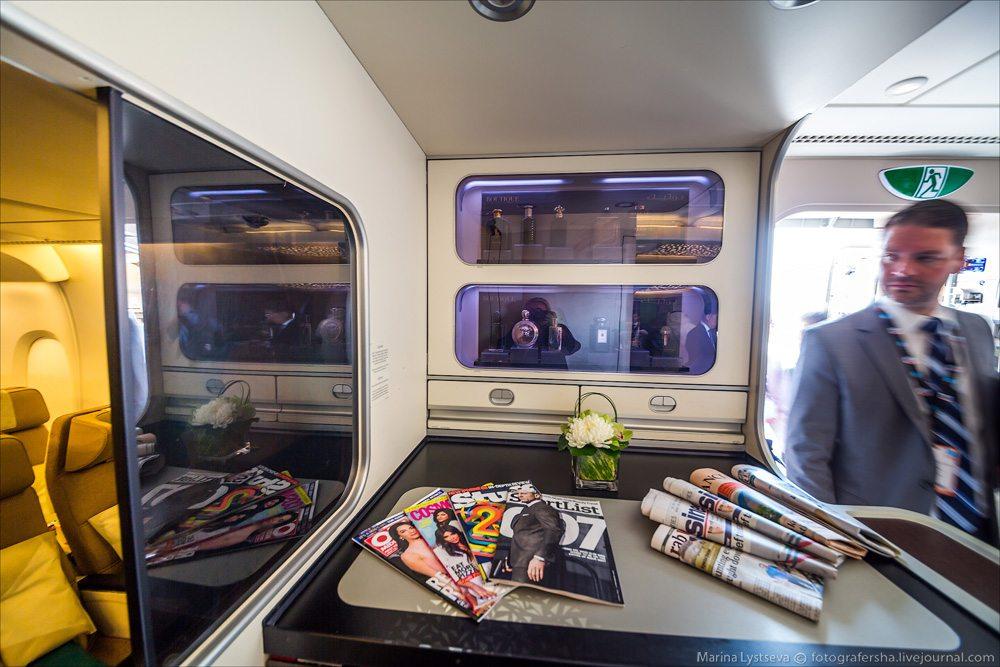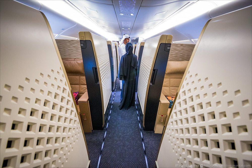 Итак, для того чтобы попасть в бизнес-класс, пассажиры должны подняться на второй уровень уже на борту самолета. Там места распределены по трем ценовым категориям. 1. Можно только сидеть, 2. Можно и сидеть и лежать, 3. Пассажирам дают отдельные небольшие купе.
