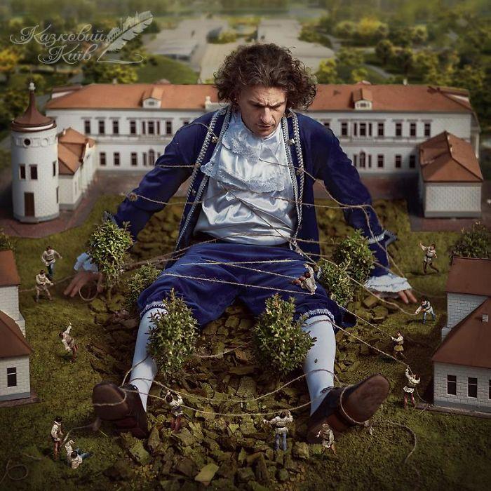 Примечательно, что среди героев фотопроекта есть уже покойный Скрябин, который предстал в роли Гулливера в стране лилипутов.