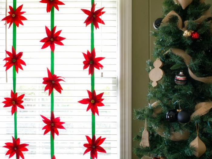 Новогоднюю гирлянду из окна можно не только вырезать или склеить, но и пошить. Для того чтобы ткань держала форму, накрахмальте ее или пропитайте смесью ПВА с водой.