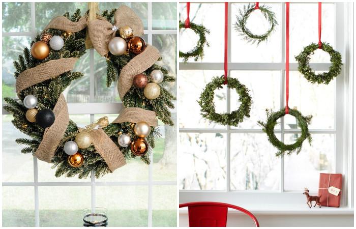 Привычное место для размещения новогоднего венка – входная дверь. Но им можно украсить и окно. Если готового венка нет, то его можно сделать за пару мину из тонких веток хвойных деревьев.