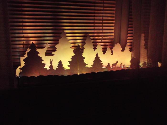 Вырежьте из бумаги очертания домов и склейте их в форме прямоугольника. Внутрь миниатюрного пейзажа положите гирлянду или поставьте электрические свечи – так декор будет пожаробезопасен.