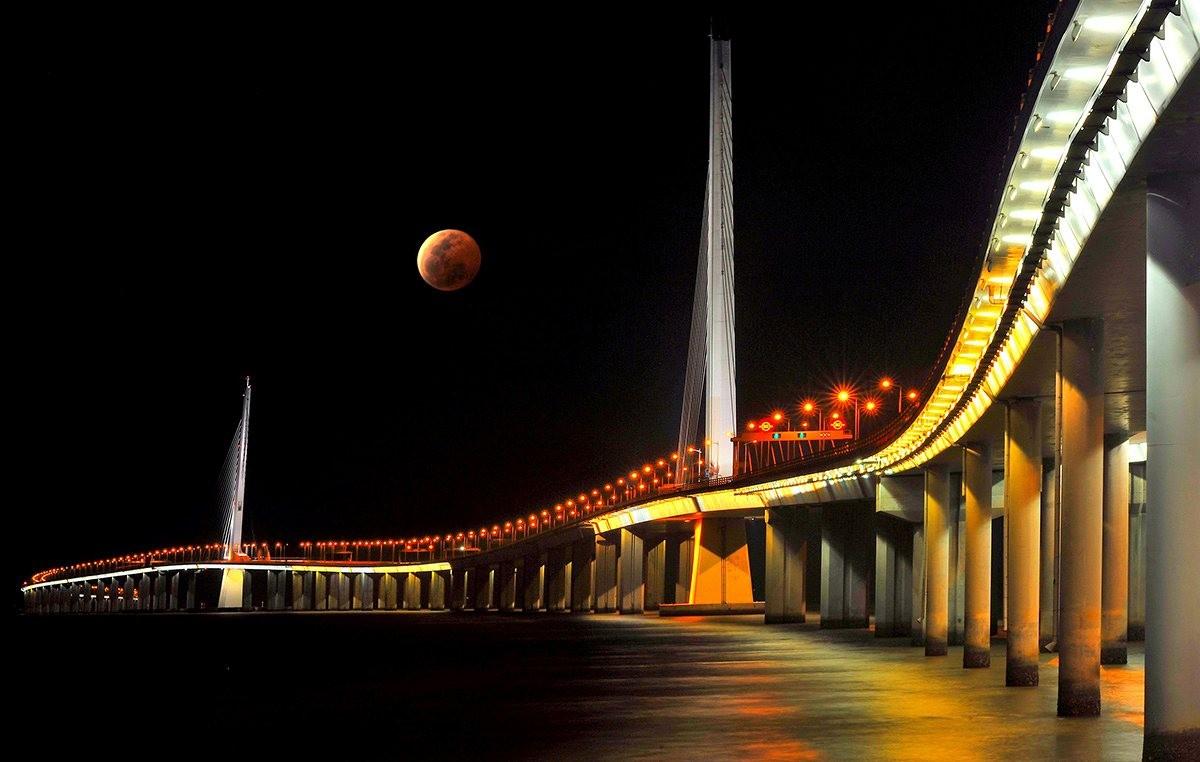 Восходящая красная луна, которая смотрит на мост через залив, Шэньчжэнь, Китай.