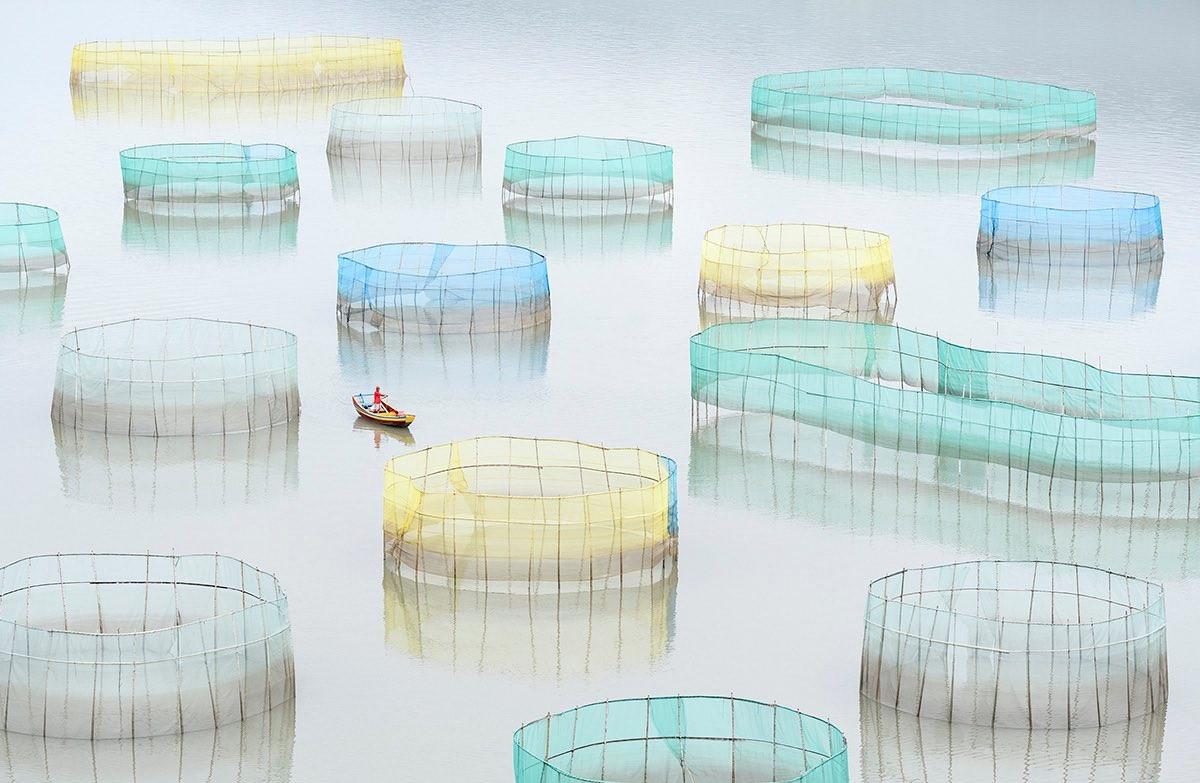 Работник фермы проверяет сети, выставленные на больших крабов в море, Фуцзянь, Китай.