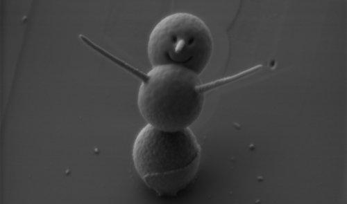 Несмотря на название "снеговик", эта крошечная фигурка изготовлена отнюдь не из снега. Она состоит из трех кварцевых сфер, диаметром 0.9 микрона, изготовленных и скрепленных между собой при помощи технологии электронно-лучевой литографии. Глаза и улыбающийся рот снеговика были вырезаны при помощи сфокусированного луча ионов, а руки и нос фигурки были изготовлены из платины так же при помощи ионного луча.