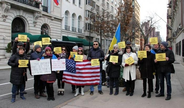 Для того чтобы поддержать украинского политзаключенного к посольству России в Нью-Йорке пришли местные активисты, чтобы высказать общественную позицию и требовать освобождения режиссера.
