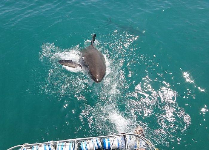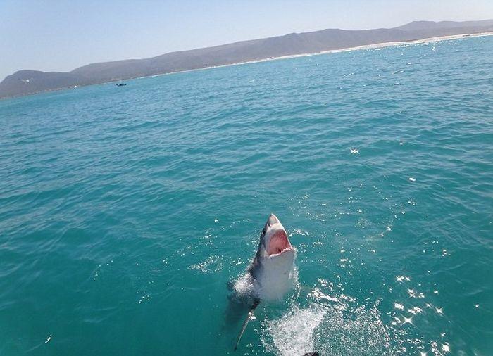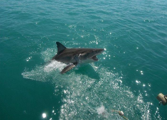 В какой-то момент приманкой, которая тащила за собой яхта, заинтересовалась 4-метровая акула, которая стала выпрыгивать из воды, пытаясь схватить добычу. Находящиеся на борту туристы не могли упустить столь подходящий момент и сделали эти замечательные снимки.