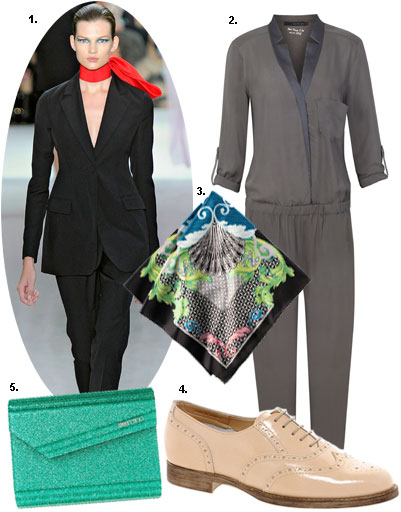 1. Christian Dior, весна-лето 2013; 2) комбинезон Calvin Klein Jeans; 3) платок H&M; 4) туфли Asos