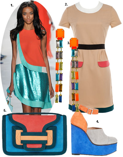 1) Diane von Fürstenberg, весна-лето 2013; 2) платье Kira Plastinina; 3) серьги Asos; 4) туфли Topshop; 5) сумка Pierre Hardy