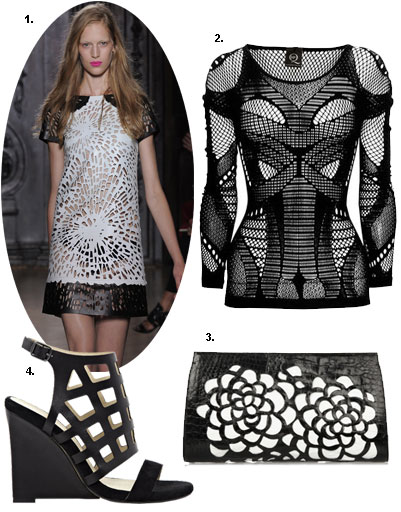 1) Giles, весна-лето 2013; 2) топ MCQ Alexander McQueen; 3) клатч Nancy Gonzalez; 4) туфли River Island