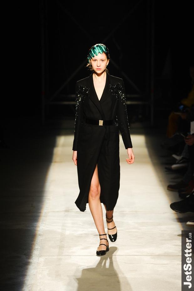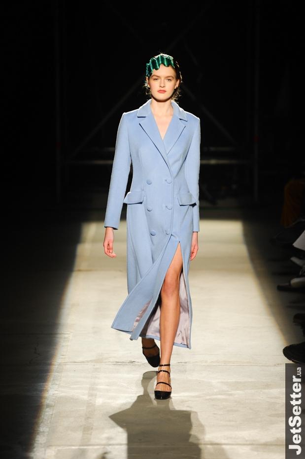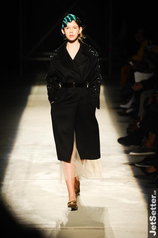 Основа коллекции – закрытые платья ниже колена, строгие костюмы и пальто кроя оверсайз.