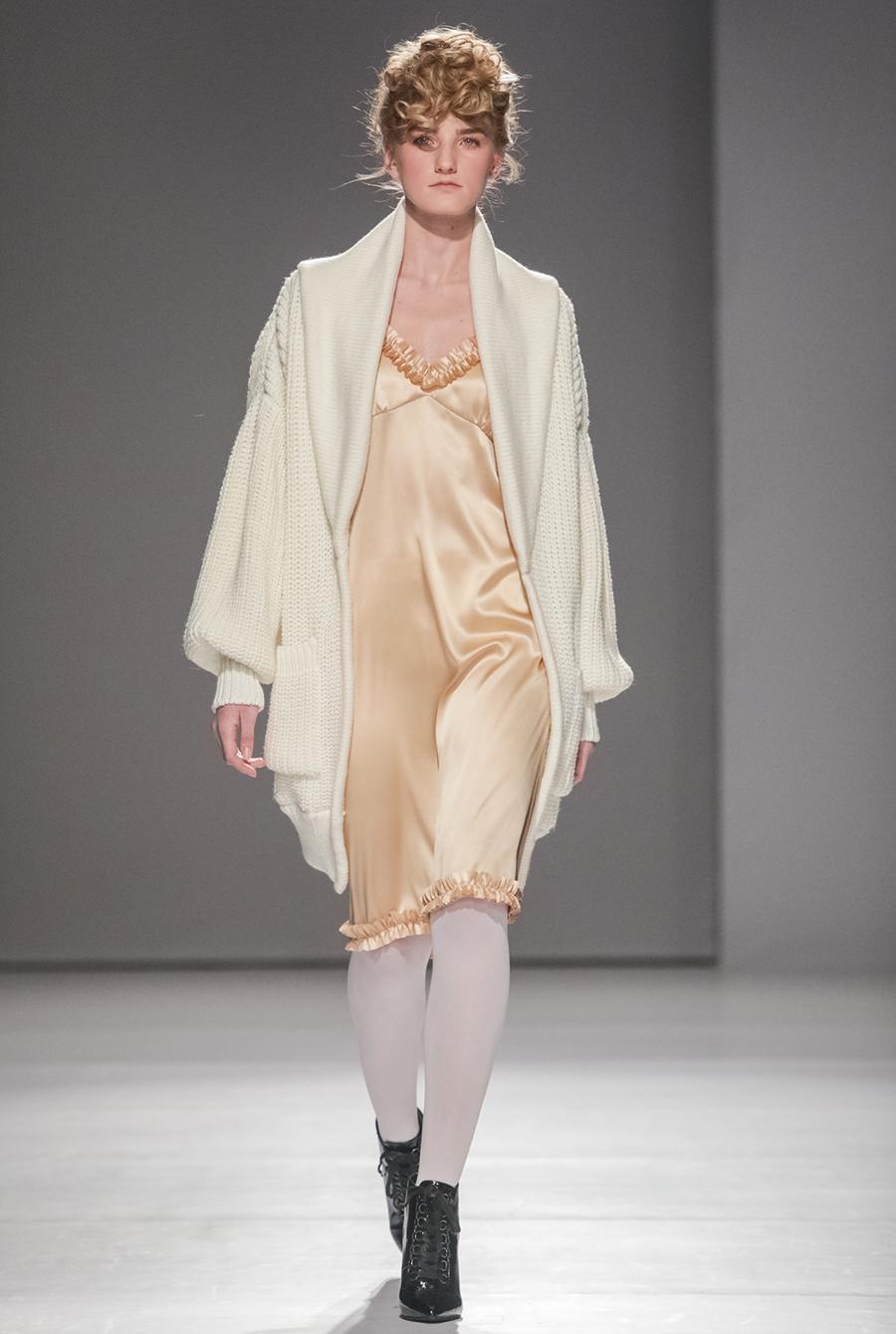 Виктория Баланюк не побоялась экспериментировать и скомбинировала тонкие струящиеся платья с необычными грубыми шерстяными кардиганами.
