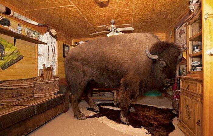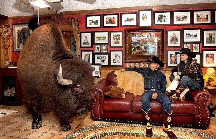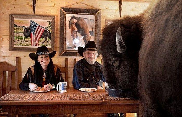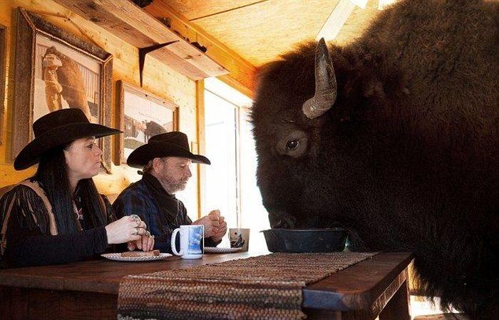 Этого бизона зовут Savage, он обожает смотреть телевизор вместе с хозяевами, а принимает пищу он исключительно с хозяйского стола, как полноправный член семьи.