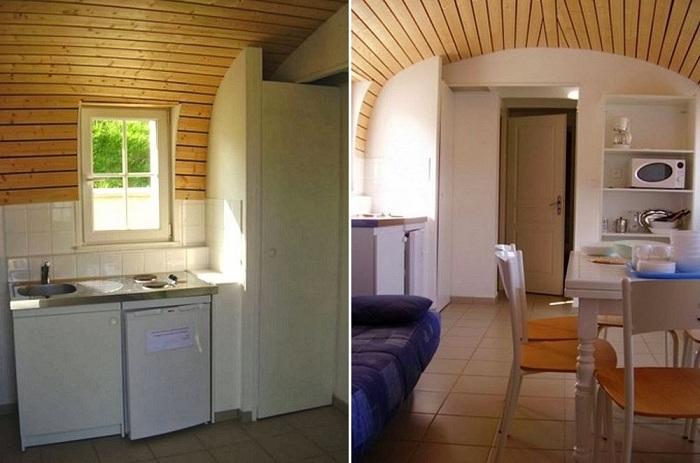 Дом-лодка был длинным и нешироким и состоял всего из одной комнаты. Из-за необычной конструкции интерьер был темным и душным. Пространство для приготовления еды и сна разделялось занавесками.