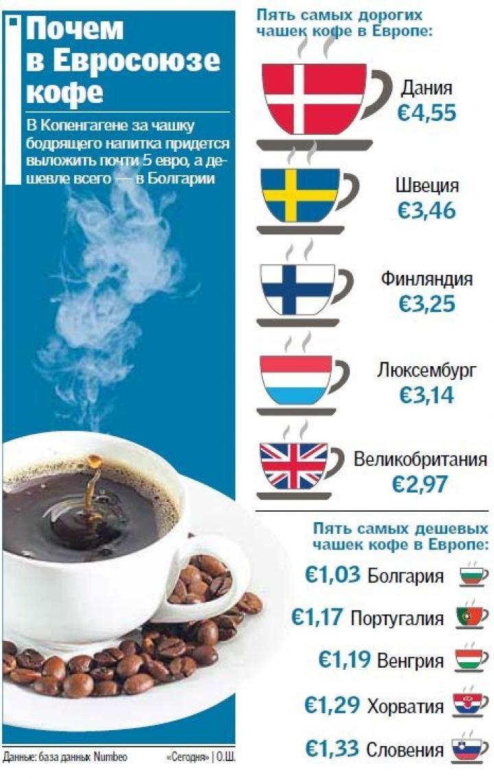 На представленной ниже инфографике можно увидеть, сколько стоит чашка кофе в разных странах ЕС.
