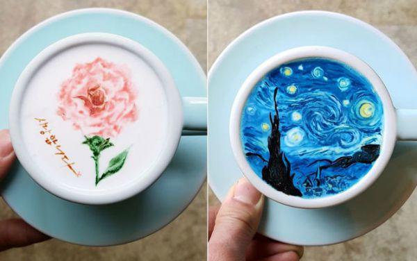 С помощью натуральных красителей Канбин Ли создает полноценные картины, которые радуют посетителей его кафе.