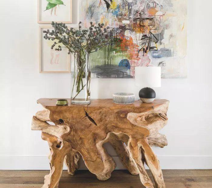 Здесь дизайнеры сочетали все свои смелые идеи. К примеру, стол из ствола дерева с причудливым граффити, или же небольшой журнальный столик, сделанный по типу мебельной обивки.