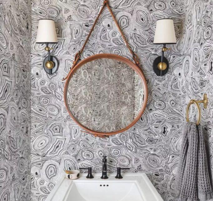 Зеркало в ванной из кожи, которой отражает анималистический рисунок на стене и не только.