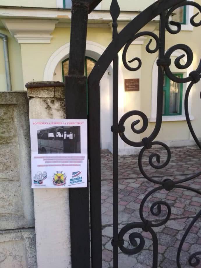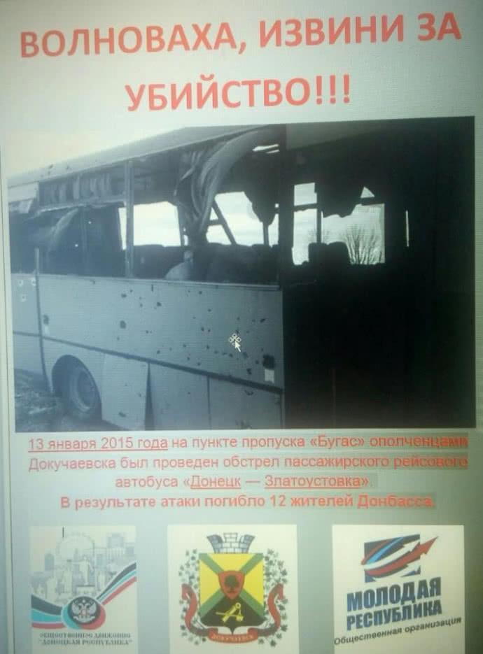 На листовках с фотографией автобуса написано: "Волноваха, извини за убийство!".